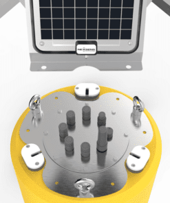 La boya está fabricada con un núcleo interior de espuma de polietileno reticulado y una resistente cubierta de poliurea. Una torre de acero inoxidable de 13″ de altura en la parte superior incluye tres paneles solares semiflexibles de 10 vatios 12VDC, y un pozo de datos central de 10″ ID x 13,5″ de altura acomoda baterías, registradores de datos, sensores y más. Tres orificios pasantes de 2″ con roscas inferiores NPT hembra permiten la conexión rápida de tuberías de despliegue de instrumentos y soportes de sensores personalizados. El armazón de acero inoxidable admite amarres de punto único y multipunto.