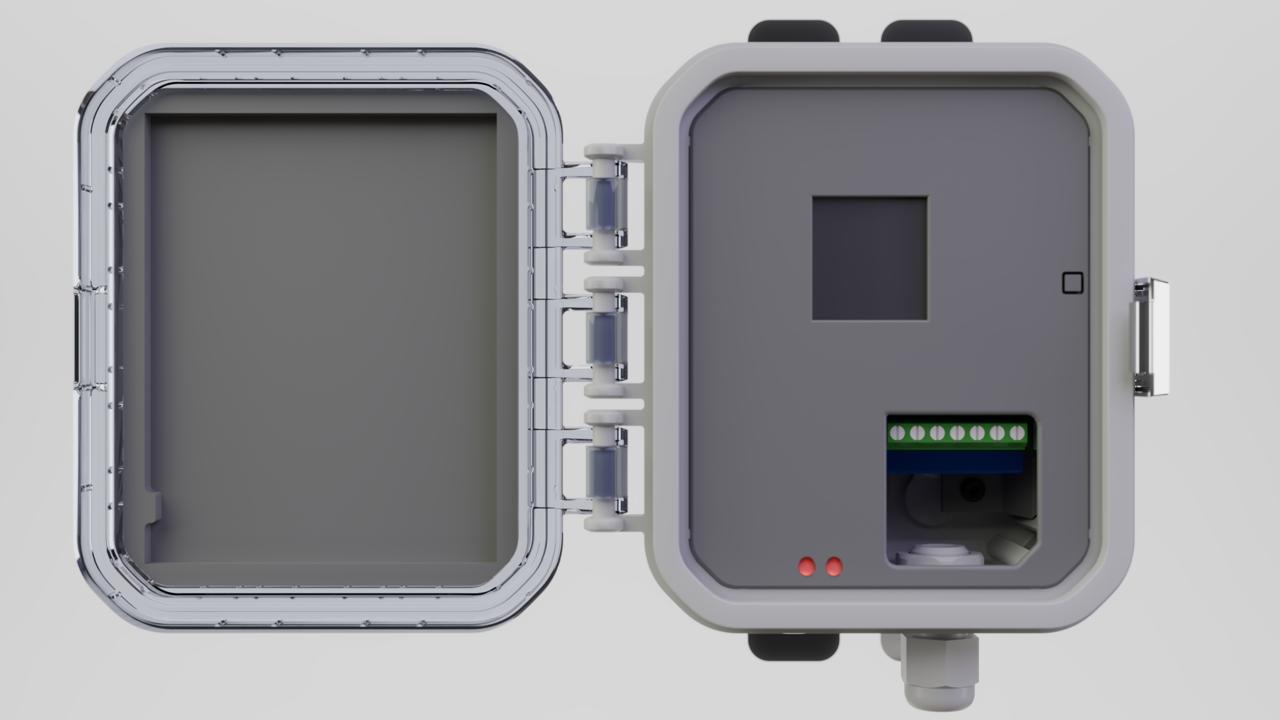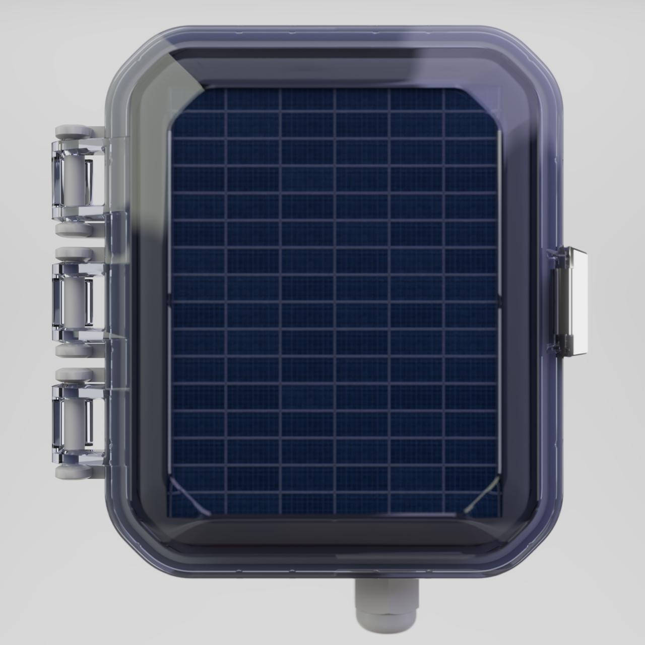 - Caja IP67 con ventana superior para panel solar.